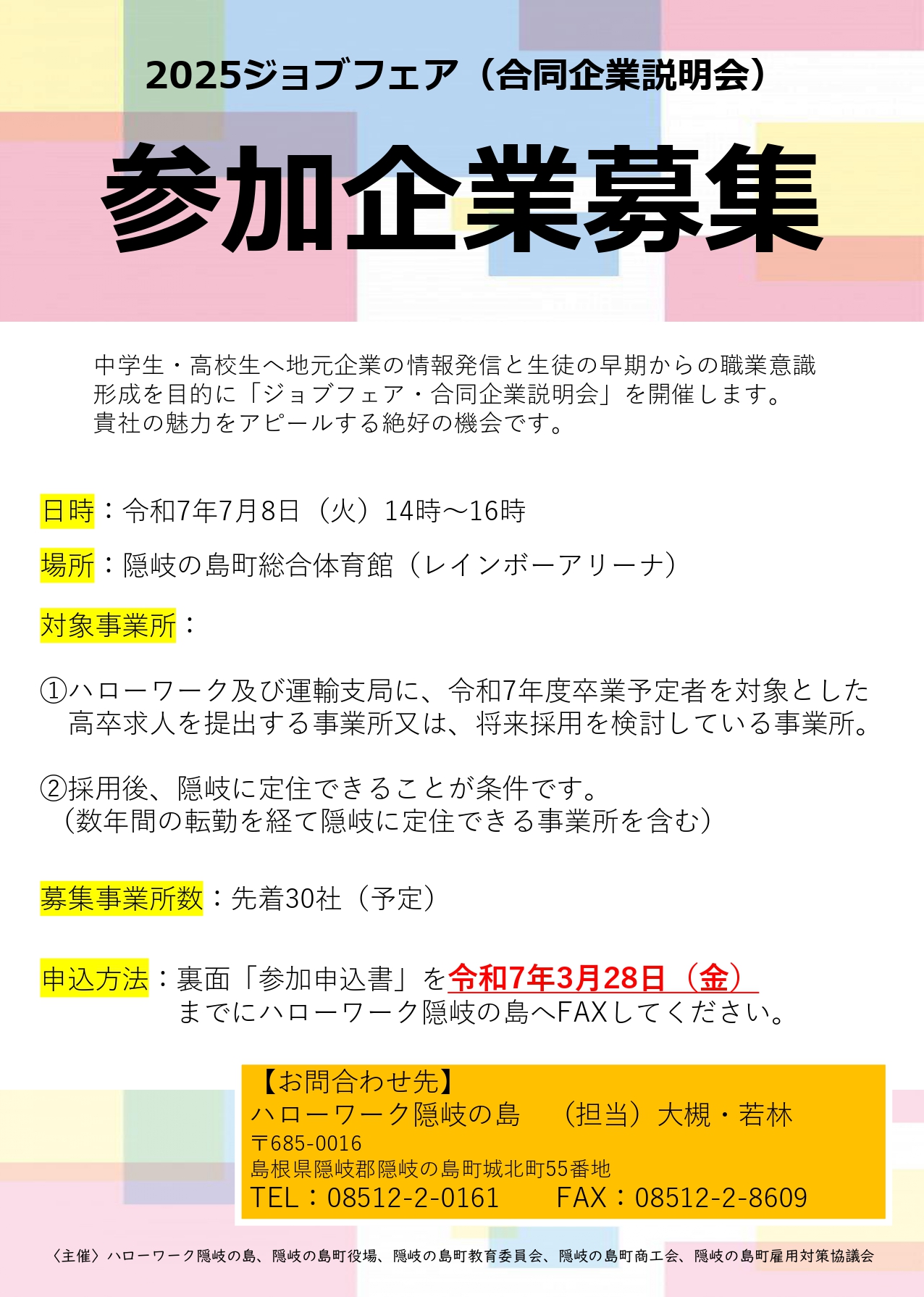 ●主 催 ハローワーク隠岐の島、隠岐の島町、隠岐の島町教育委員会、隠岐の島町商工会
