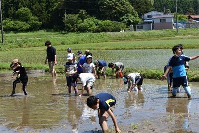 5月27日に4年生は、地域の方の田んぼをお借りし、田植え体験を行いました。児童の日記には、「田んぼの中はぬるぬるしてつめたかった」「田植えをしてみて米作りの大変さが分かった。普段食べるお米を大切にしたいと思った」と体験できたからこそ書ける具体的な文章がたくさんありました。今後は、看板や新聞作りを行いながら米への愛着を深め、秋の収穫を楽しみにしたいと思います。