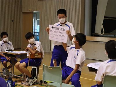 全校で竹島の歴史や現状について学びました。また、領土問題の平和的な解決に向けて自分たちにできることについて話し合いました。