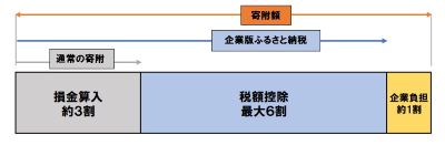 現行の地方自治体に対する法人の寄附に係る損金算入措置による軽減効果(約3割)と合わせて、寄附額の約9割に相当する額が軽減されます。
