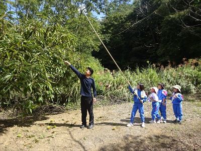 栗拾いと言っても、落ちている栗を拾うのではなく、自分たちで落とした栗を拾っていきます。木の枝についているイガを棒でたたいて落としたり、落とした栗を竹の棒で開いたりして栗を集めていきました。イガを落とすのは難しく、何度もたたいていました。慣れてくるとイガが多く集まっているところを見つけて上から一度で叩き落とすことができました。そして、毎年恒例となったイガを触ること。2年生は昨年度の経験から騒ぐことなく包み込むように触り「痛くない!」感触を得ました。1年生も素手で触りましたが、痛がることなく上手に持つことができました。
