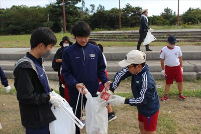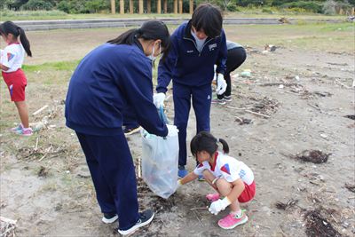 都万保育所、都万小学校、都万中学校が縦割りでそれぞれの班に分かれ塩の浜の清掃活動に取り組みました。それぞれの交流を深めるとともに、地元“塩の浜”をきれいにすることができました。