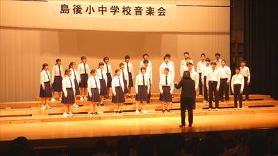 全校生徒で混声三部合唱の2曲「大切なもの」と「Fight」を披露しました。全校生徒31名と少数ですが、素晴らしい合唱を文化会館に響かせることができました。