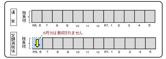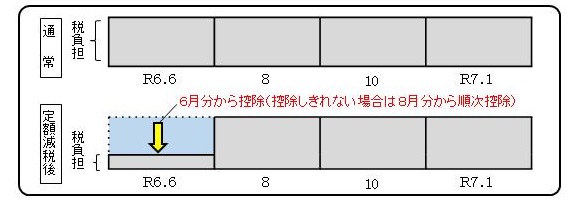 第1期分(令和6年6月)の税額から減税し、減税しきれない場合は第2期以降の税額から減税します。