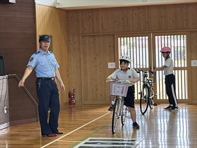 全校児童を対象に、駐在所の方を指導者に交通安全教室を開催しました。DVDによる学習をしたり実際に自転車に乗って安全を確認したりして、交通安全に対する意識と実践力を高めました。