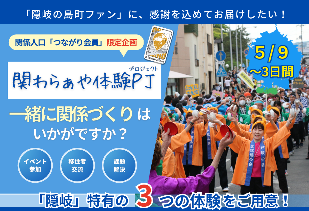 隠岐の島町の関係人口「つながり会員」と本町との体験・交流イベントを企画・実施することで、関係人口拡大に向けた取り組みの強化と関わりの機会を提供する目的