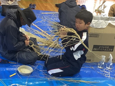 長年続いているPTA行事のしめ飾り作りが行われ、地域の方に教えていただきながら親子でしめ飾り作りを行いました。